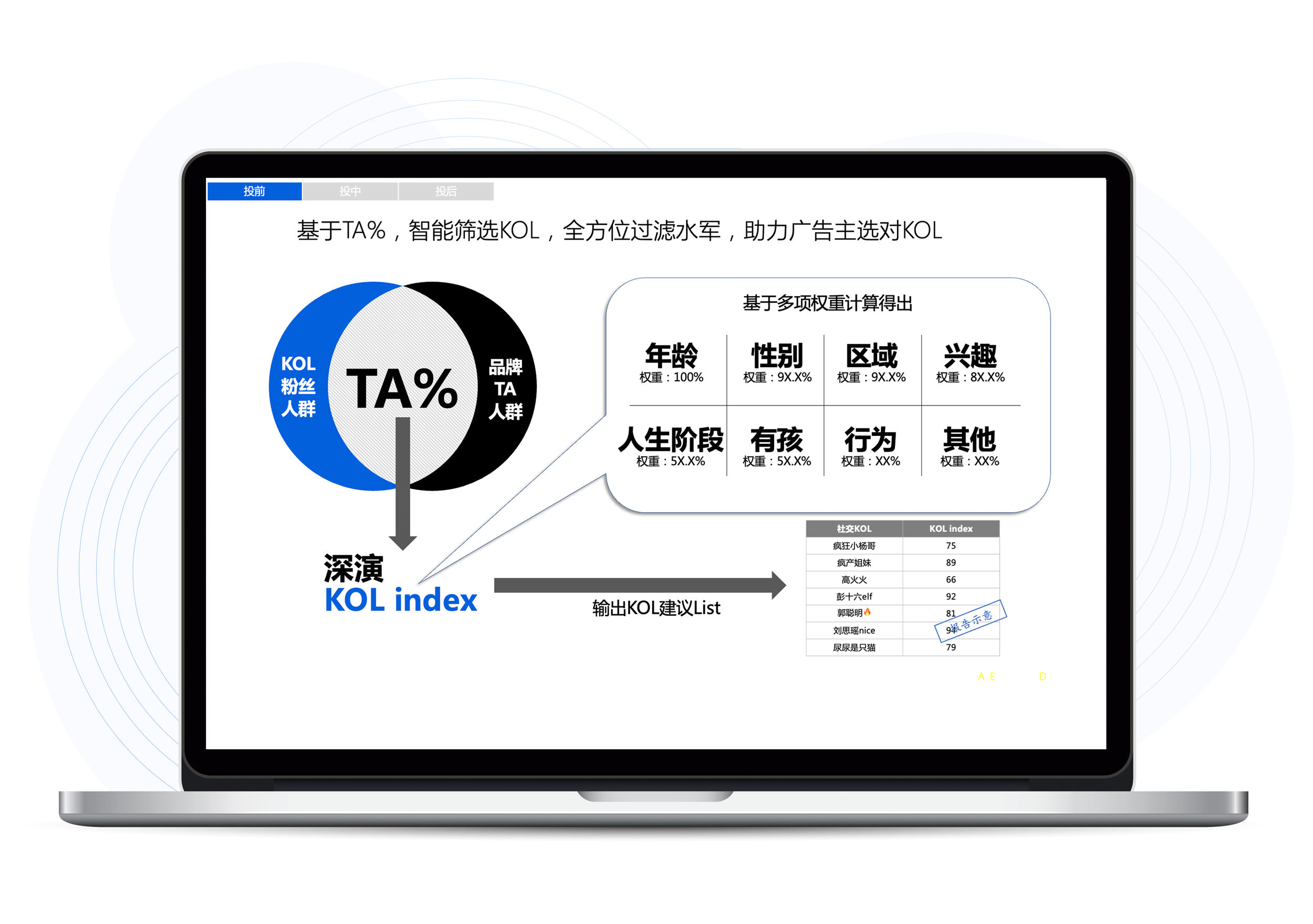 九洲国际K参谋科学前选可以跨领域找到最能影响品牌目标人群的KOL进行投放,同时有效平衡投资回报率